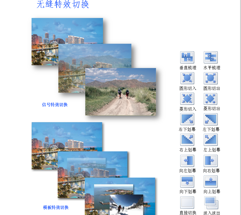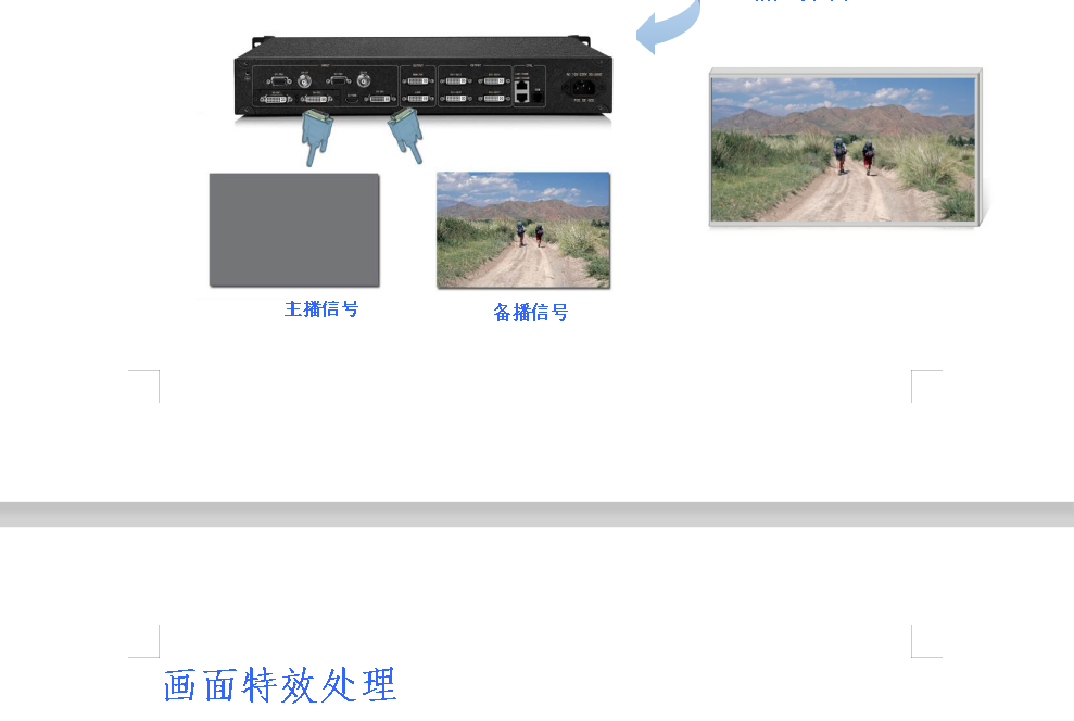 特效切換 | ·信號(hào)及模式切換時(shí),用戶可選擇不同的特效,包括:淡入淡出,無縫直切,垂直、水平梳理,圓形切入、切出,菱形切入、切出,各個(gè)方向的劃幕 |