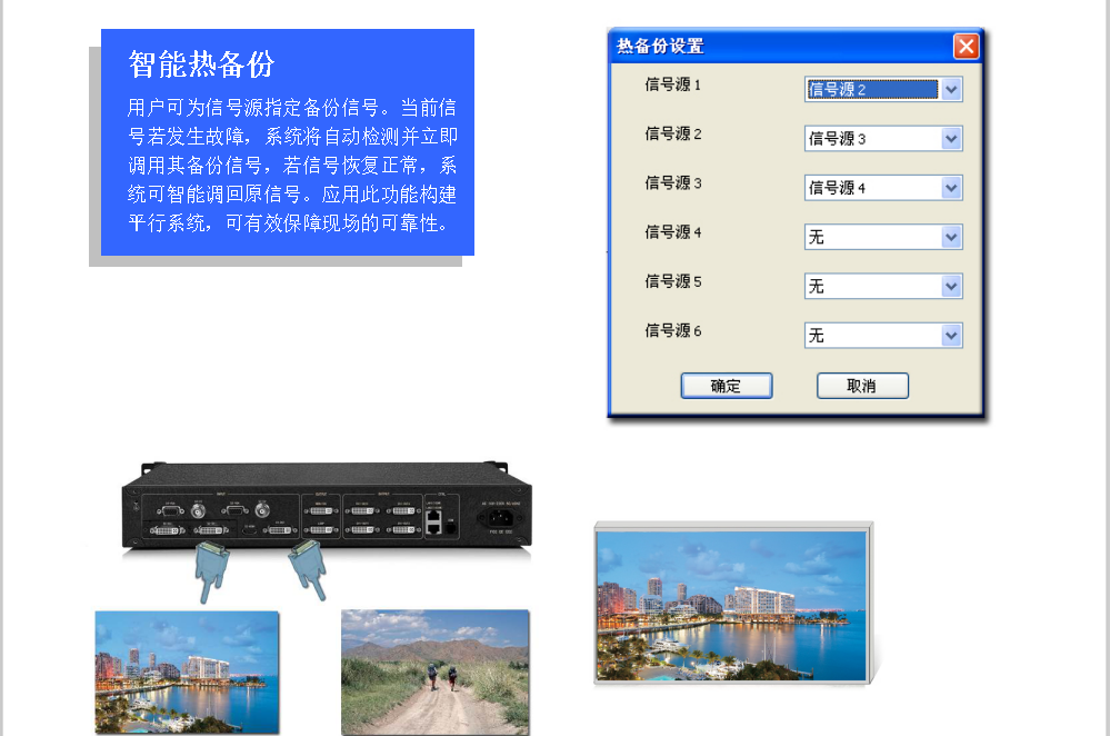 熱備份功能 | ·用戶可對輸入信號(hào)指定備份信號(hào),當(dāng)前信號(hào)故障時(shí),系統(tǒng)自動(dòng)輸出備份信號(hào),當(dāng)信號(hào)恢復(fù)時(shí)可自動(dòng)跳回 |