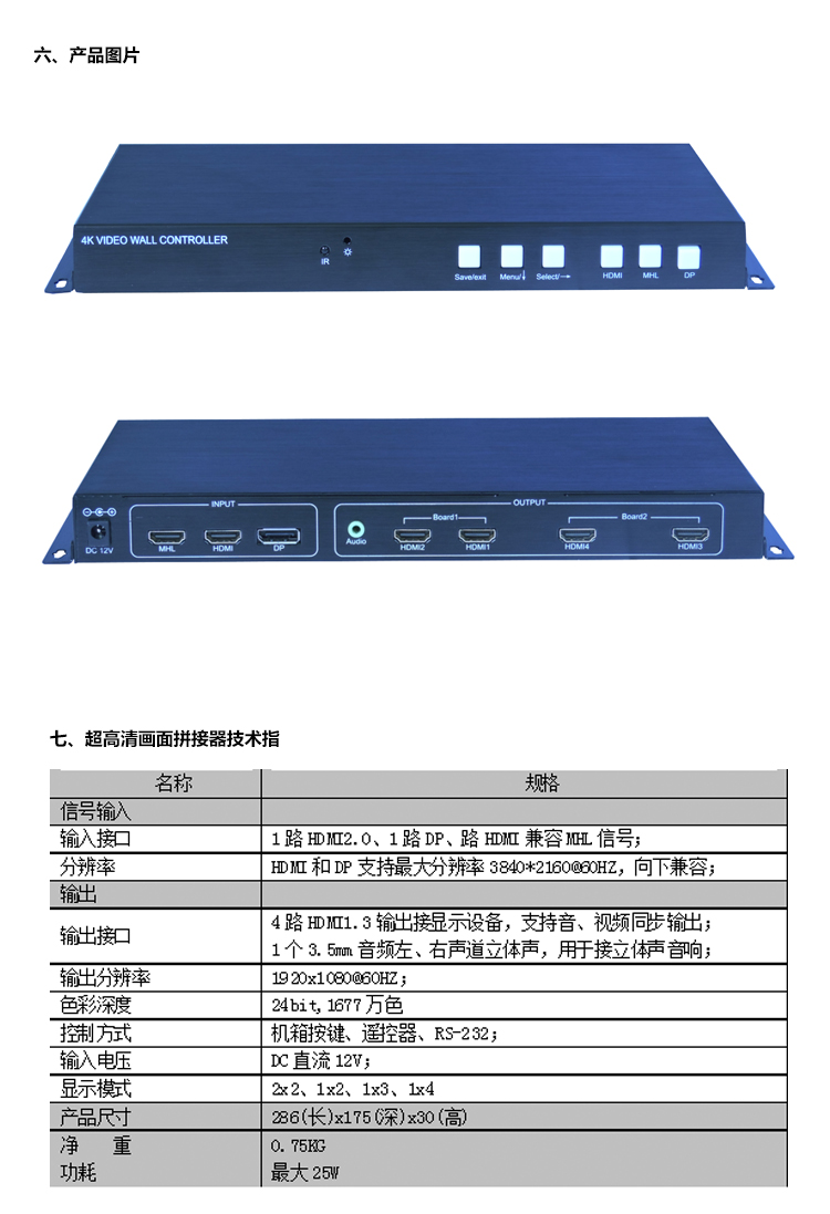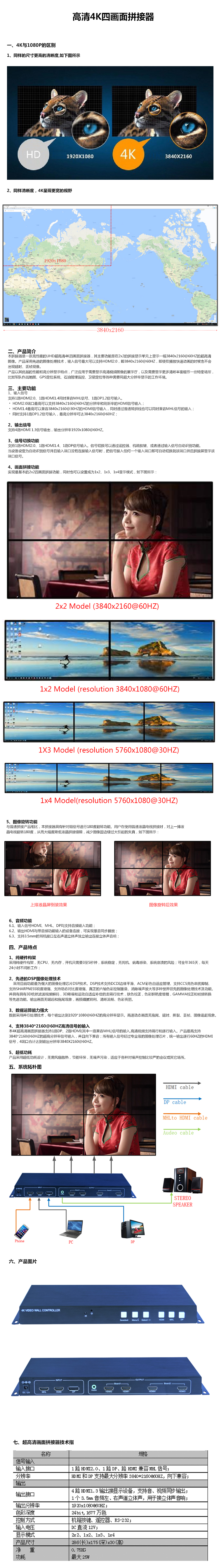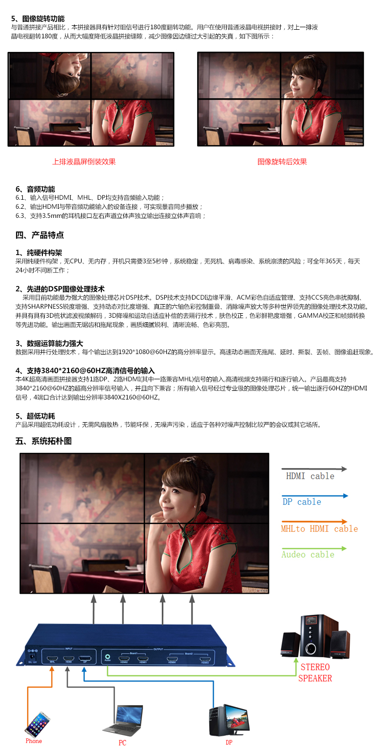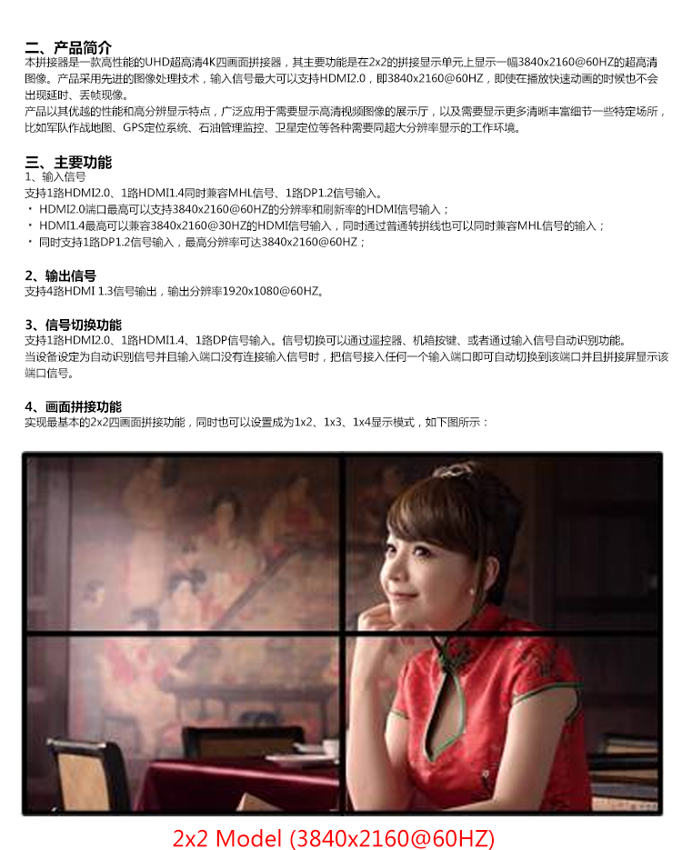 本產(chǎn)品是定制化的4K畫面拼接器,其主要功能是在M x N的拼接顯示單元上顯示一幅3840x2160@60HZ的超高清4K圖像。產(chǎn)品采用先進(jìn)的圖像處理技術(shù),輸入信號(hào)最大可以支持HDMI2.0,即3840x2160@60HZ,即使在播放快速動(dòng)畫的時(shí)候也不會(huì)出現(xiàn)延時(shí)、丟幀現(xiàn)像。